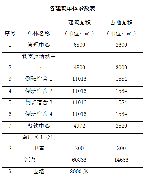 4、采購項目內(nèi)容包括:管理中心、食堂及活動中心、倒班宿舍(暫定四棟)、餐飲中心、南廠區(qū)門衛(wèi)室、圍墻立面概念設(shè)計,各單體參數(shù)如下表: