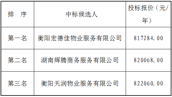衡陽弘湘國有投資(控股)集團有限公司院內物業(yè)服務采購項目于2020年6月29日上午10時00分(北京時間)進行了比選開標、評標活動,評標委員會按照招標文件規(guī)定的評標辦法及原則進行評定,確定中標候選人如下: