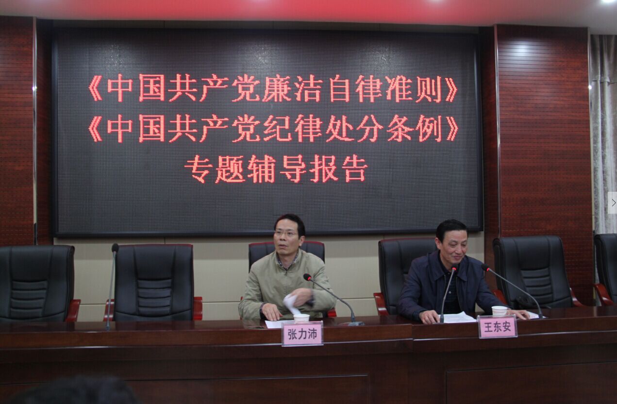 11月17日下午,弘湘公司組織全體干部職工、子公司班子成員及參(控)股公司主要負(fù)責(zé)人學(xué)習(xí)貫徹新修訂的《中國共產(chǎn)黨廉潔自律準(zhǔn)則》和《中國共產(chǎn)黨紀(jì)律處分條例》(以下簡稱《準(zhǔn)則》和《條例》)報(bào)告會。市紀(jì)委正處級紀(jì)檢監(jiān)察員、市監(jiān)察局副局長王東安做專題輔導(dǎo),弘湘公司黨組書記、董事長張力沛主持報(bào)告會并作講話。